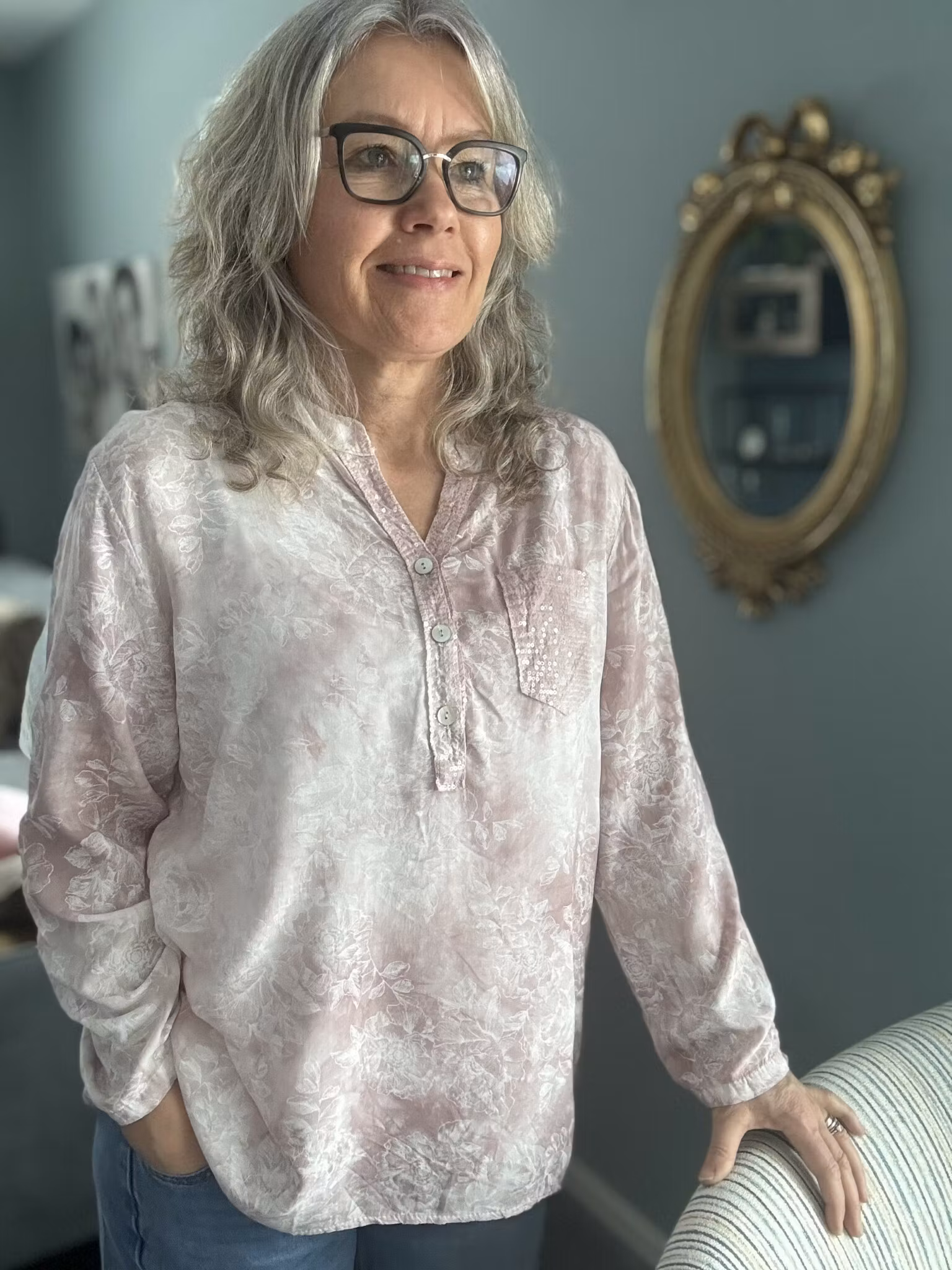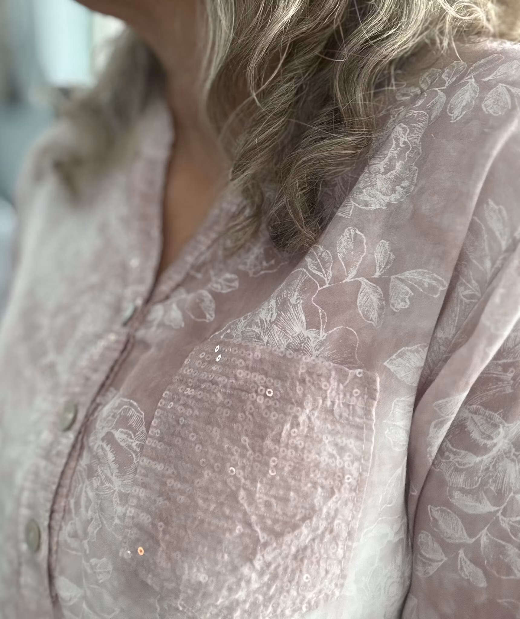 En ljusrosaskjorta med fina detaljer i form av paljetter på ficka och ringning. Storleken är onesize och passar st 36-46 bäst.