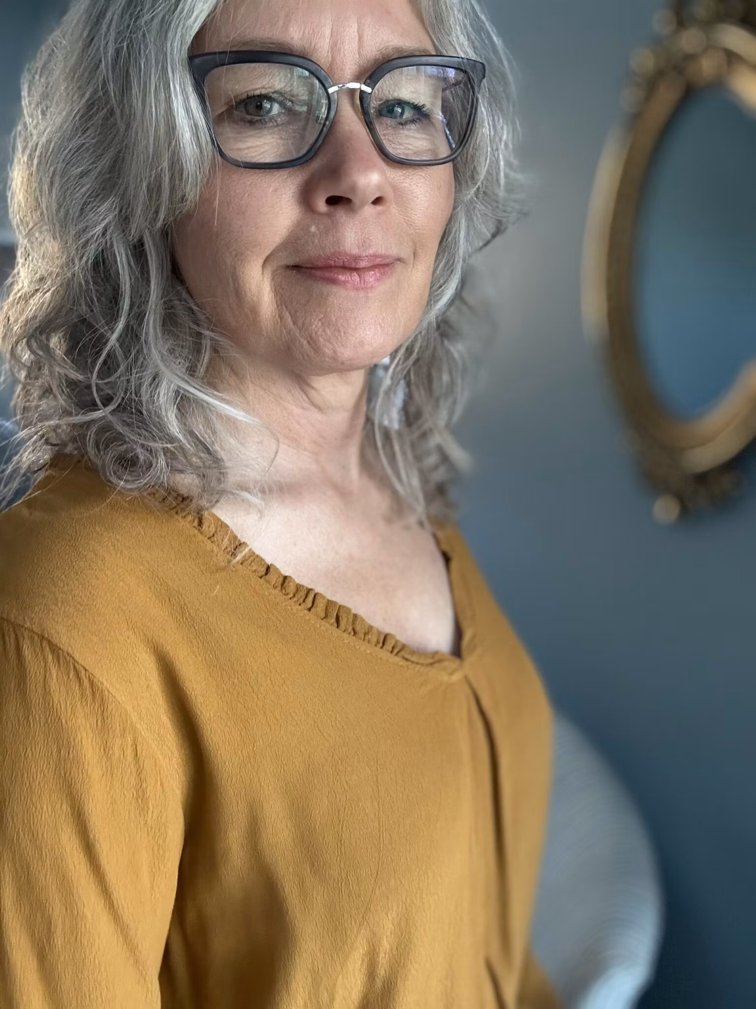 En Senapsgul topp med snygg detalj i halsringning, smockresår i ärmslut. Vecket ger lite extra rymd över byst. Toppen finns 2 storlekar - M/L, L/XL