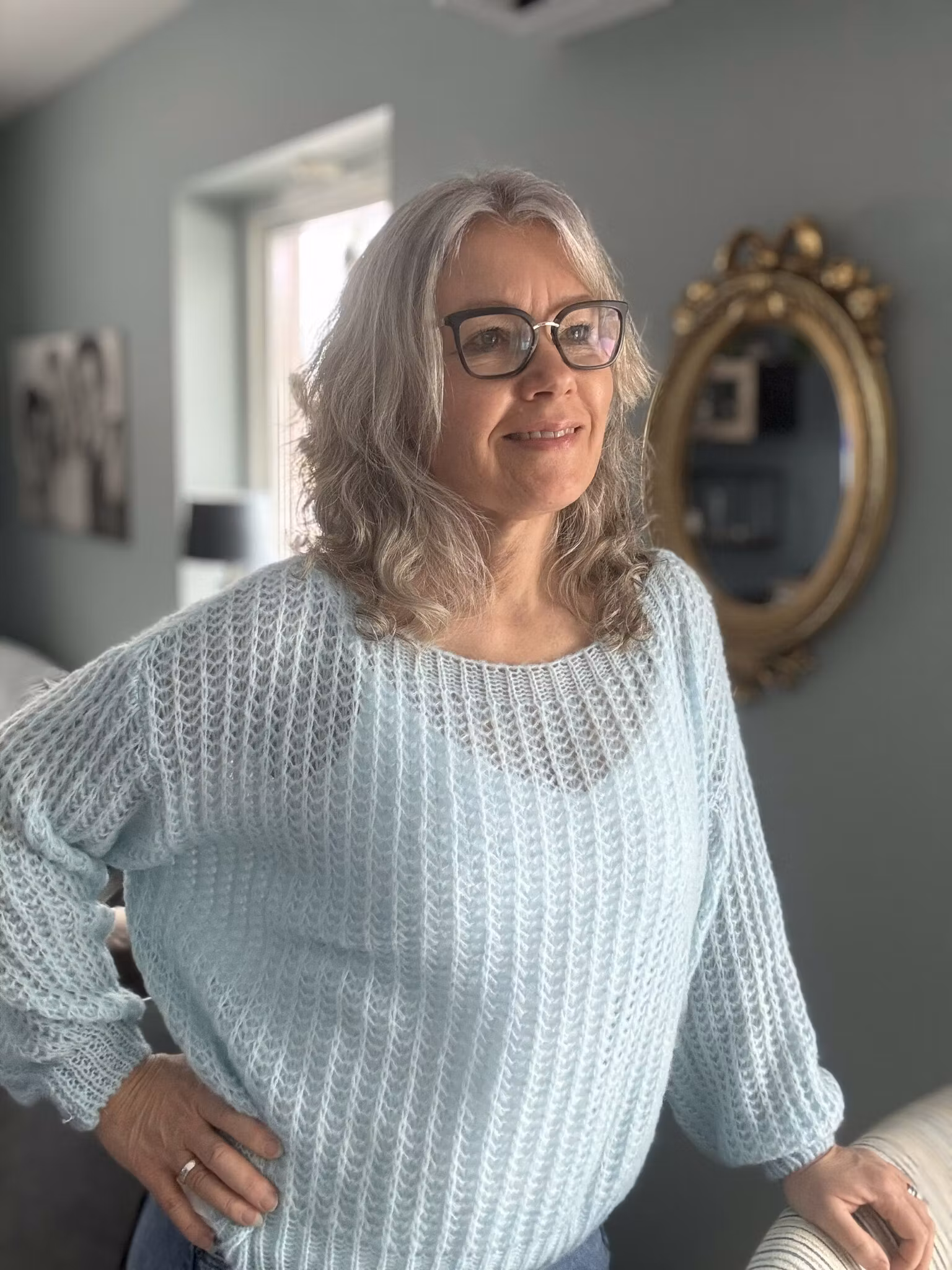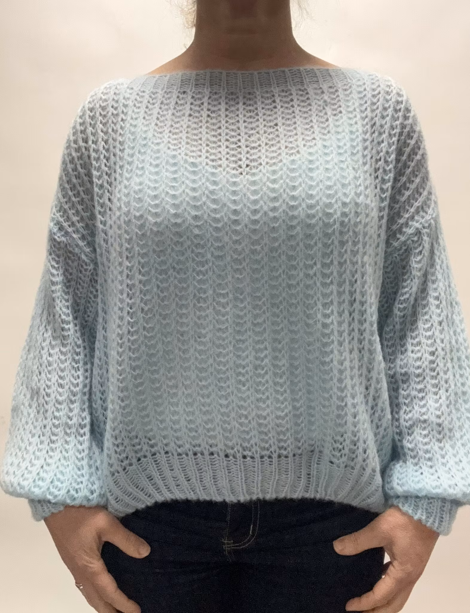 En finstickad tröja med ballongärm och båtringning. Storleken är onesize och fungerar bra 36-44. Är du lång får du fundera över längden på tröjan. Modell