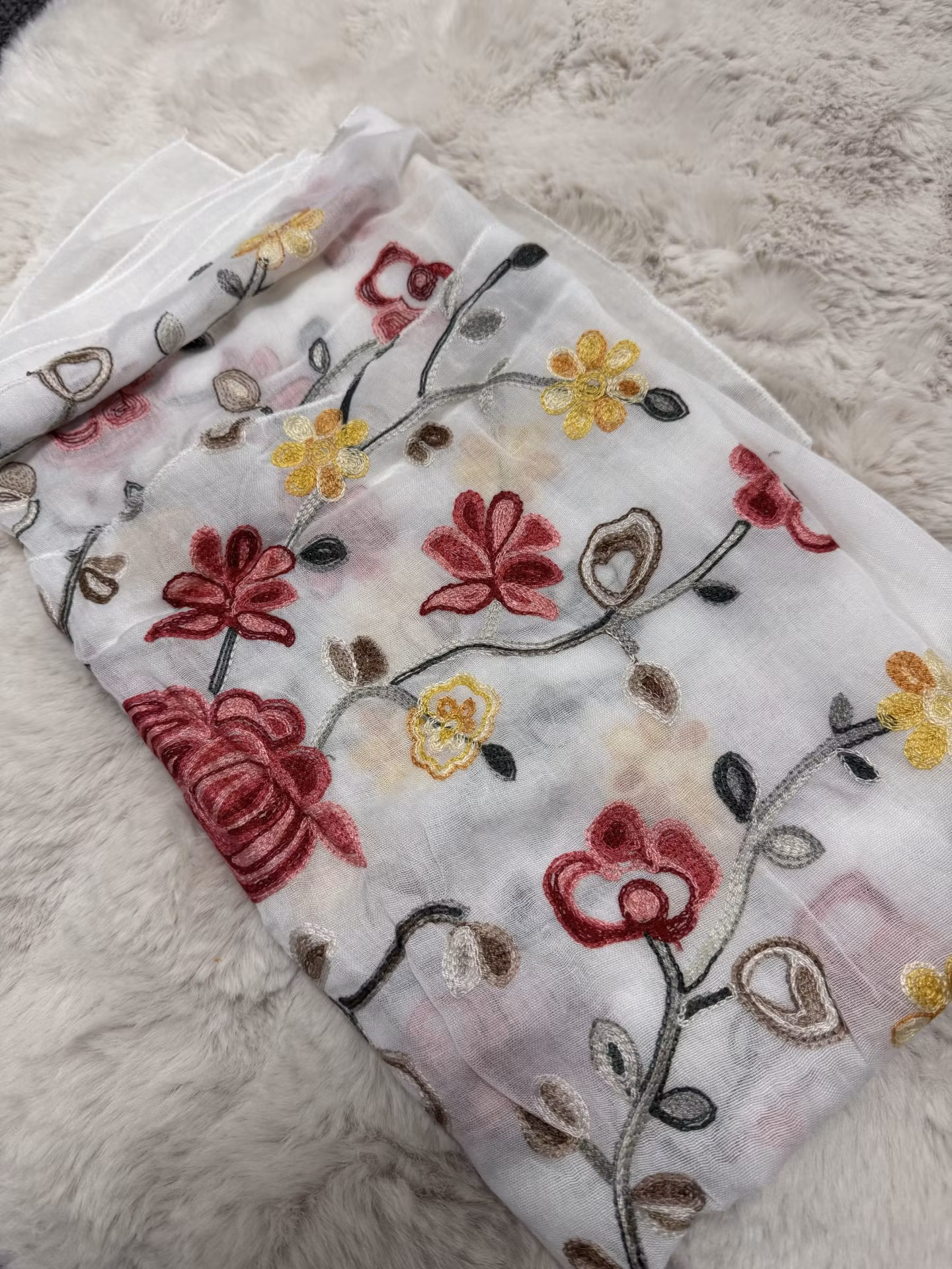 En fin scarf med vit botten. Broderade blommor i många olika färger. I grunden skulle jag säga att den passar kalla årstider bäst men är enkel att kombinera til