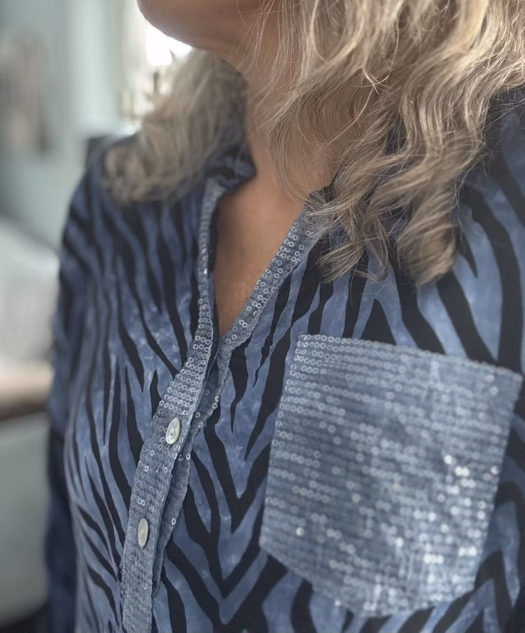 En Secondhandskjorta med fina detaljer i form av paljetter på ficka och ringning. Storleken är onesize och passar st 36-44 bäst. Materiel : 100 % Viscose&n